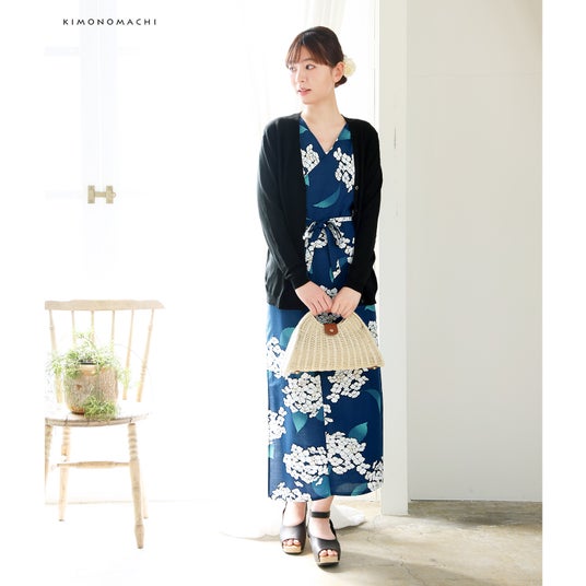 洋服としても浴衣としても美しい形のワンピースとしてカシュクールタイプを採用カシュクールとは、前で左右の身頃を打ち合わせて着る形のことです。浴衣と同じ前合わせの構造なので浴衣としての着姿も自然。直線的なスカート部分のライン、浴衣の衿から見えないネックラインなど、通常の浴衣とほぼ変わらないシルエットとなるよう、細部まで作りこまれています。