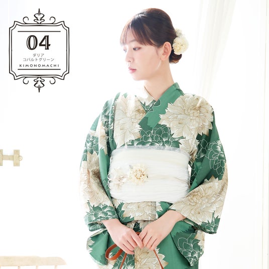 浴衣:グレイッシュなコバルトグリーンの地に、の花のシルエット。グレイッシュな薄茶色の線に白で表現された大輪のダリアの花。オフホワイトの輪郭線で表現されたダリアが奥行きを与えています。