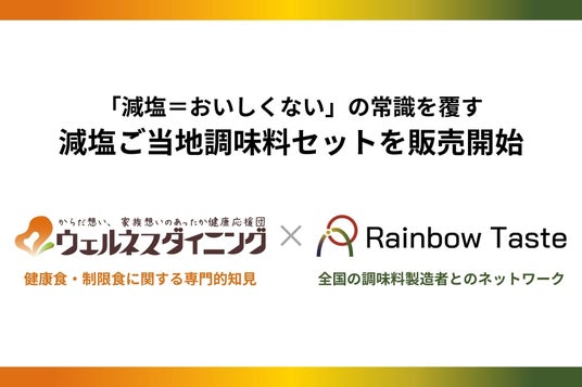 株式会社Rainbow Taste(本社:東京都新宿区、代表取締役:寺門里紗)は、食事制限専門の「健康宅配食」と「栄養相談」を提供するウェルネスダイニング株式会社(本社:東京都墨田区、代表取締役:中本哲宏)と協業し、「減塩調味料セット」を開発・販売開始いたしました。本商品は、管理栄養士が約100種類のご当地調味料の中から厳選したもので、塩分やカリウムを控えながらも本格的な味わいと満足感を実現しています。本協業を通じて、日本の豊かな食文化を大切にしながら、健康的な食生活の実現に貢献してまいります。