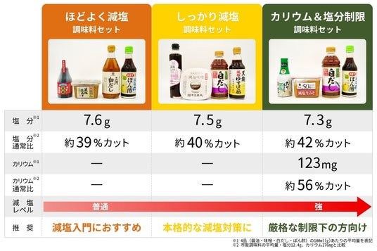 このような背景から、全国の調味料製造者とのネットワークを持つ当社と、健康食・制限食の知見を持つウェルネスダイニングが協業し、減塩でありながらもおいしさを損なわない調味料セットの開発に至りました。
