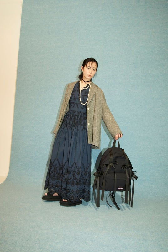 裏地なしの軽やかなジャケットとオリジナル柄のカットワーク生地を使用した華やかなワンピースに、UGGとEASTPAKの小物を合わせることでカジュアルダウン。