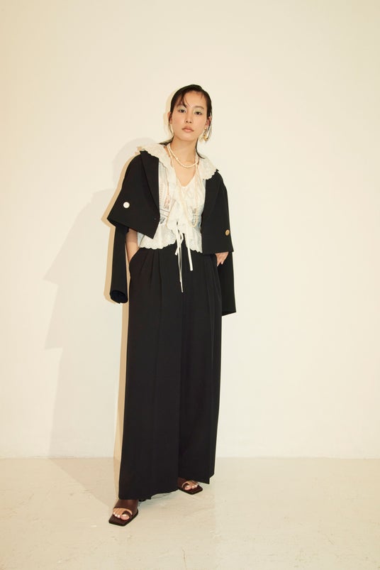 コンパクトでショートな丈感でバランスを取りやすいジャケットと細いタックがポイントのハイウエストパンツを合わせてセットアップ風に。襟から裾にかけてオリジナルのレース刺繍をあしらい、身頃に繊細なバラの柄や細かい穴のはしごレースをライン使いしたコットン素材のブラウスを合わせてフェミニンさも。