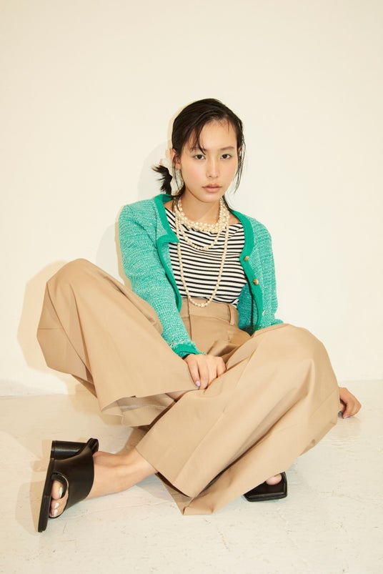 スパンコール糸とラメ糸を使用した春らしいニットツイードが目を引くコーディネート。アシンメトリーにドレープが入っているボーダーのリブニットと2タックのワイドシルエットのチノパンツを合わせてオシャレ上級者に。