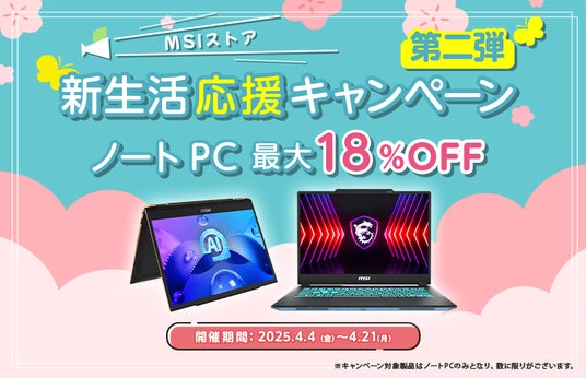 この度、エムエスアイコンピュータージャパン株式会社は2025年4月4日(金)から4月21日(月)まで、キヤノンマーケティングジャパン株式会社が運営するMSI公式オンラインショップ(以下、MSIストア)にて、最新モデルを含む対象ノートPCが最大18%OFFになる『MSIストア 新生活応援キャンペーン 第二弾』(以下、本キャンペーン)を開催いたします。