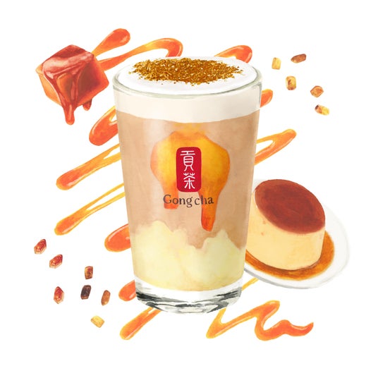 プリンを入れた濃厚なミルクティーは寒い冬ならではのアイデアで「冬のご褒美ドリンク」というテーマにもぴったりです。
