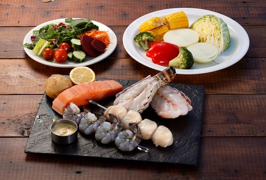 帆立貝柱、シュリンプ、ロブスター、ベイクドポテト
