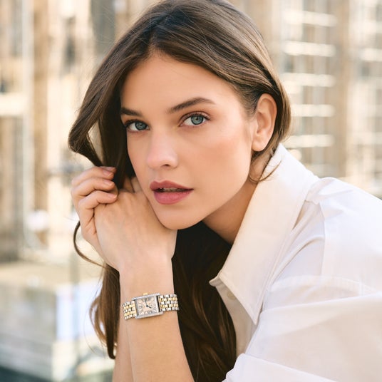 ケースの洗練されたシルエットに沿って、38個のトップ・ウェッセルトン・ダイアモンド(合計0.456カラット)があしらわれたデザインと、ダイアモンドを使用しないエレガントでさりげないデザインの2つを展開。ブレスレットもケースの美学に呼応し、ステンレススティールとイエローゴールドキャップまたはローズゴールドキャップのパーツを交互に組み合わせ、しなやかで快適な着け心地を実現しています。