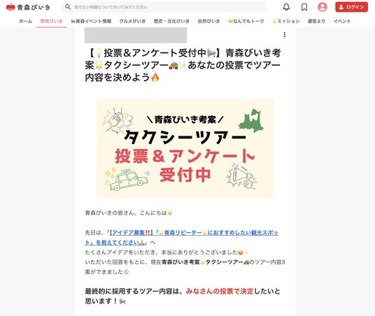 タクシーツアー、ホテルのコンセプトルームについてアイデア募集から投票まで共創し、青森県内外からの観光客の誘致を目指します。