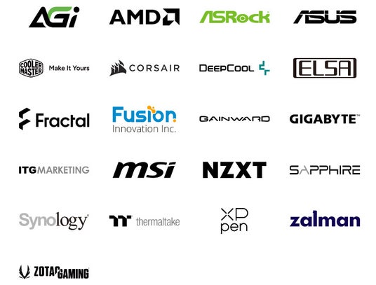 AGI、AMD、ASRock、ASUS、Cooler Master、CORSAIR、Deepcool、ELSA、Fractal Design、Fusion Innovation、GAINWARD、GIGABYTE、ITGマーケティング、MSI、NZXT、SAPPHIRE、Synology、Thermaltake、XPPen、ZALMAN、ZOTAC