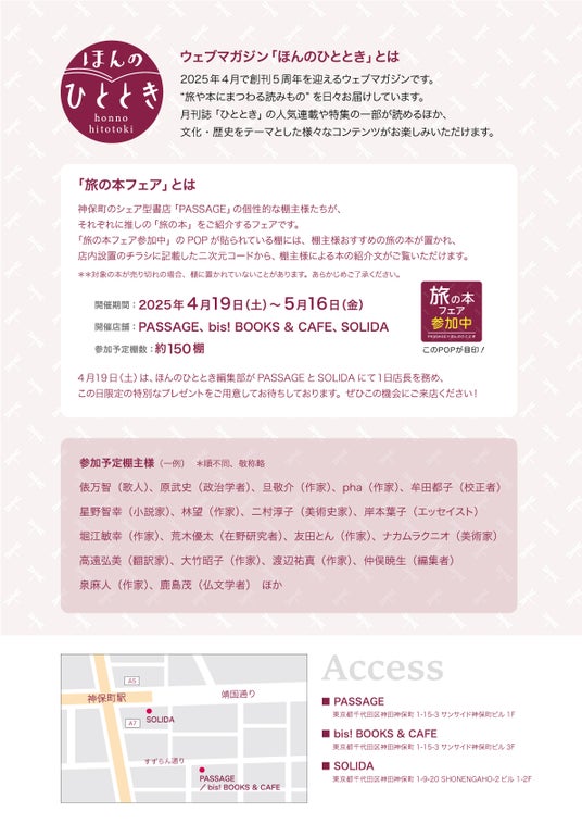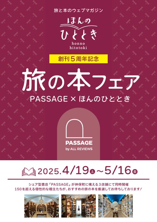 神田神保町と神楽坂でシェア型書店を営むALL REVIEWS株式会社(本社:東京都千代田区、代表取締役:由井 緑郎)と、株式会社ウェッジ(本社:東京都千代田区、代表取締役社長:江尻 良)が運営するウェブマガジン「ほんのひととき」は、創刊5周年を記念して、2025年4月19日(土)より合同で「旅の本フェア」を開催いたします。
