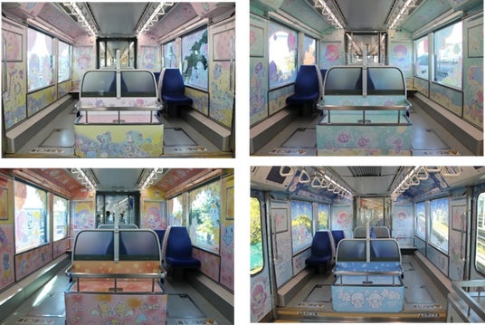 2021年11月からオリジナルラッピングで運行している「キキ&ララ モノレール」トゥインクルツ アー編成の車内は四季がテーマ。イルカさんやペンギンさん等のキキ&ララの珍しいおともだちも