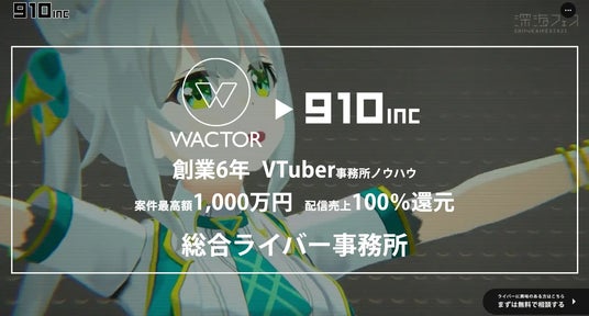 VTuber黎明期である2018年からVライバー事務所としても、広告代理店としても展開するVTuberマーケティング企業WACTOR《企業概要》事業:広告代理店&ライバー事務所( https://910.inc )&グッズ製造OEM&オンラインくじサイト / 取引先:DMM.com様長期取引/TikTok様公式一次代理店/日本テレビClaN様業務提携/SEGA様包括契約等