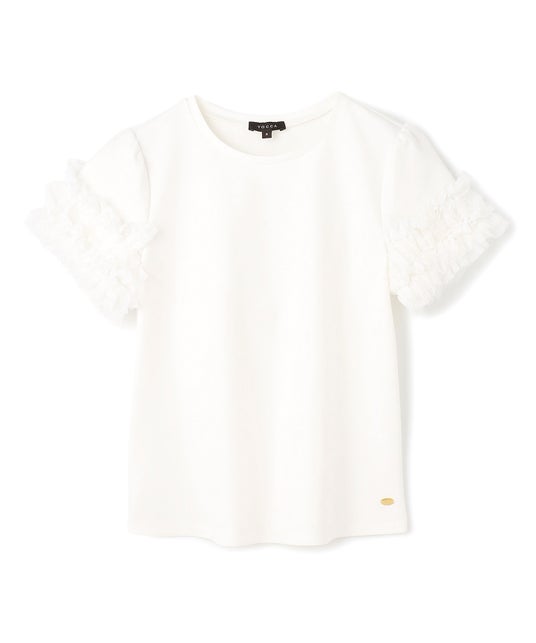 商品説明:袖部分に施されたドットチュールのフリルが愛らしい印象のTシャツ。シンプルながら袖のボリューム感が、あらゆるコーディネートも一気に格上げしてくれる、色違いで欲しくなる万能Tシャツです。