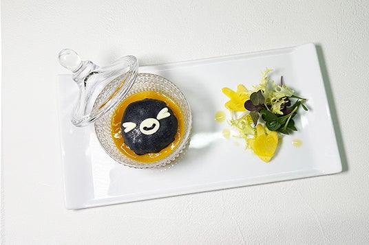 八幡平サーモンをクレープで包みこんだSuicaのペンギン 。 サーモンタルタルは足跡をかたどった 東北の野菜とともにお楽しみください。