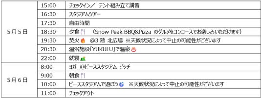 ▼チェックインからチェックアウトまで、長崎スタジアムシティ×アウトドアで楽しめる要素が盛りだくさん!タイムスケジュール