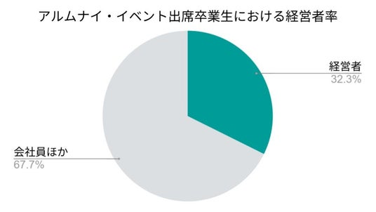 1999年の創業時から26年目を迎えるガイアックスは、新卒入社者の卒業生の約半数が起業する起業家輩出企業です。そのため、アルムナイ・イベント出席卒業生における経営者(個人事業主を含む)が占める割合は約3割となりました。
