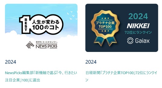 2024には、NewsPicks編集部「新機軸で選ぶ「今、行きたい注目企業」100」に選出(2024年)、日経新聞「プラチナ企業TOP100」72位にランクインしています。