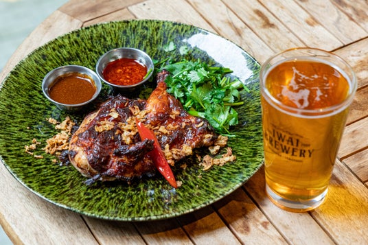 イワイ シラントロエールは東京・横浜の4店舗のアジアンレストランで、生ビールでお楽しみいただけます。定番のグリーンカレーやガパオライスはもちろん、ハーブと野菜たっぷりのバインセオ(ベトナム風お好み焼き)や、タイ風ローストチキン"ガイヤーン"など、スパイスやパクチーをたっぷり使った料理と合わせて味わうのがおすすめです!