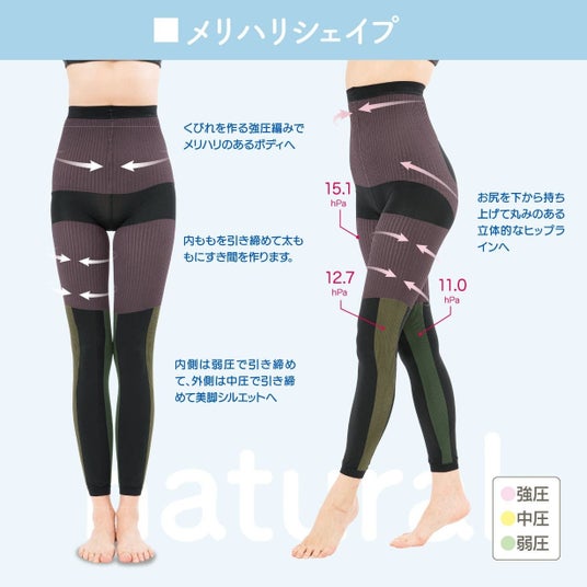 さらに、お尻は丸みを残しつつ下から持ち上げ、美しいラインをキープ。ひざ下から足首までも程よい着圧で、下半身全体のバランスをサポートします。