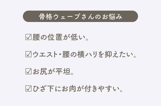 ウェーブさんのお悩みを解決するために、気になりやすいウエストや腰まわりは、ぐるりと一周しっかりサポート!横に広がりがちなラインを引き締めて、スッキリとしたシルエットへ♪