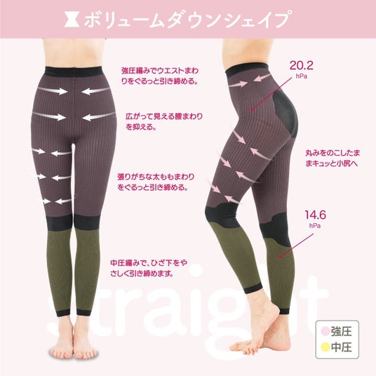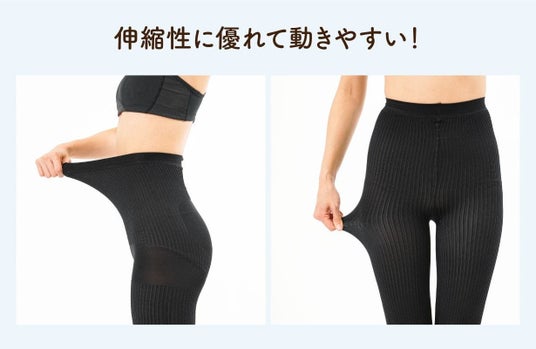 さらに、気になりやすい太ももには内側にすき間を作る設計を採用し、すらっとした美脚を演出!太ももから下は、内側をやさしく、外側をほどよく引き締める着圧設計で、関節の目立ちやすさをカバーします。
