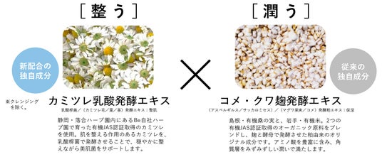 「潤う」ための保湿成分として採用してきたコメ・クワ麹発酵エキス²に加え、「整える」カミツレ乳酸発酵エキス¹を配合。より潤いを届けるために肌を整え、いきいきとしたハリ・ツヤ肌に導きます。