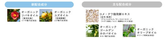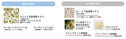 ¹ 乳酸桿菌/(カミツレ花/葉/茎)発酵エキス(整肌) ²(アスペルギルス/サッカロミセス)/(マグワ果実/コメ)発酵粕エキス(保湿) ³ シロキクラゲ多糖体(保湿) ⁴ アロエベラ液汁(保湿) ⁵ クリスマムマリチマムカルス培養液(保湿)、エリンギウムマリチムムカルス培養液(保湿) ⁶ オリーブ果実油(保湿) ⁷ ツバキ種子油(保湿) ⁸ ユズ種子油(保湿) ⁹ ココイルグルタミン酸2Na(洗浄剤) ¹⁰ クリスマムマリチマムカルス培養液(保湿) ¹¹ エリンギウムマリチムムカルス培養液(保湿) ¹² アラビアゴム(保湿) ¹³ アスコルビルグルコシド(整肌) ¹⁴ 年齢に応じた、肌のお手入れのこと。 ¹⁵ ツバキ種子油(整肌)