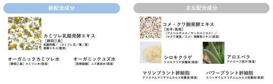 新たに着目したのは、静岡・三島で40年以上にわたりオーガニックハーブづくりをおこなっている、 落合ハーブ園内の自社農園で育ったカミツレ(カモミール)の力です。カミツレ蒸留水を抽出した後の残渣を、アップサイクル利用。未利用資源が秘めた力をバイオテクノロジーで引き出し、肌の土台が 「整う」カミツレ乳酸発酵エキス²を配合。これまで「潤う」ための保湿成分として採用してきたコ メ・クワ麹発酵エキス²とあわせ、日本古来の発酵が生んだオリジナル成分のダブル配合で、いきいき としたハリ・ツヤ肌に導きます。