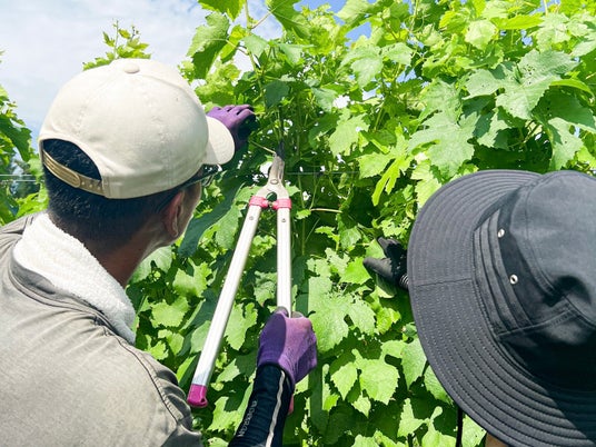 ブドウの生育を促すために行われる、「芽かき」「除葉」といった作業。従来であればそのまま土に返してしまう葉を「収穫」「加工」することで、あらたな価値を生み出しています。