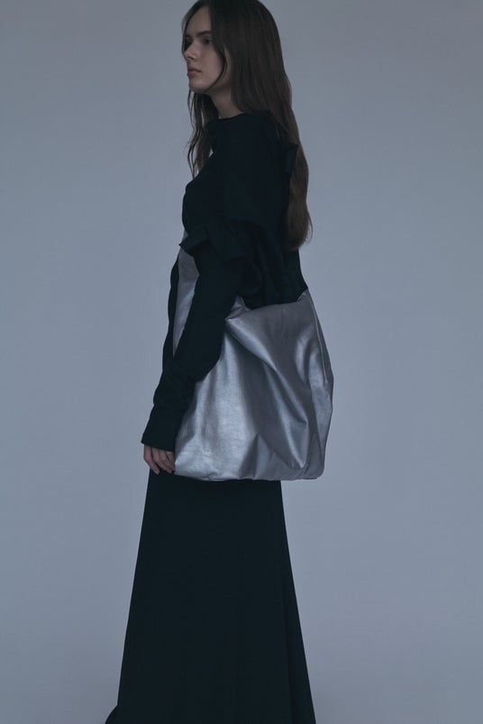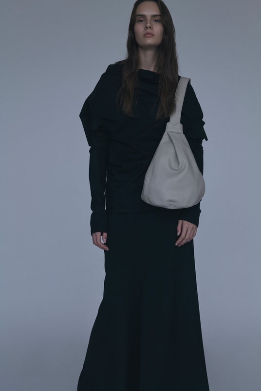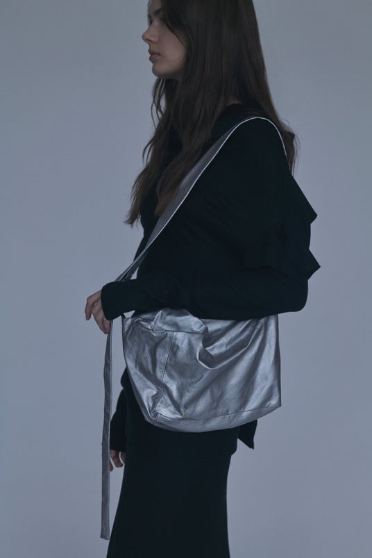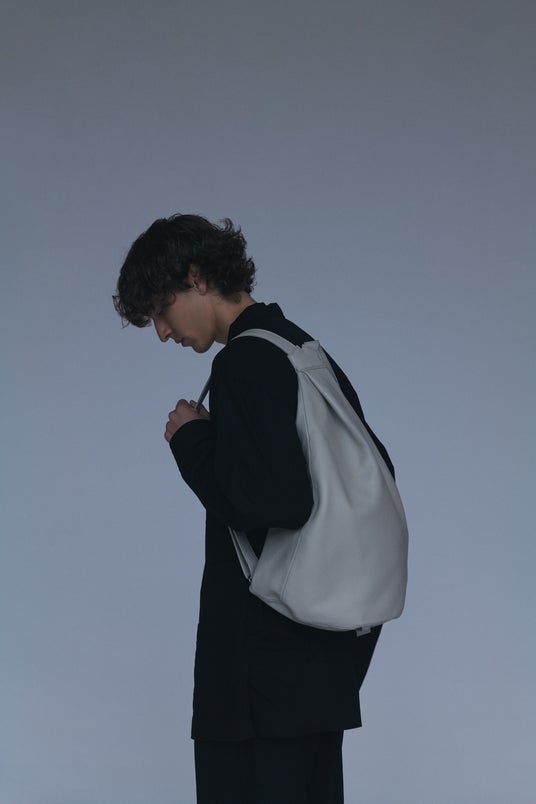 今シーズンのカラーとしてライトグレイで表現された「Y BACKPACK」。discord Yohji Yamamotoを象徴するアイコニックなフォルム。プリーツのようなデザインディテール、中にものが入った時に美しく、身につけた時に存在感が出るような服をつくるように表現されたバッグシルエット。
