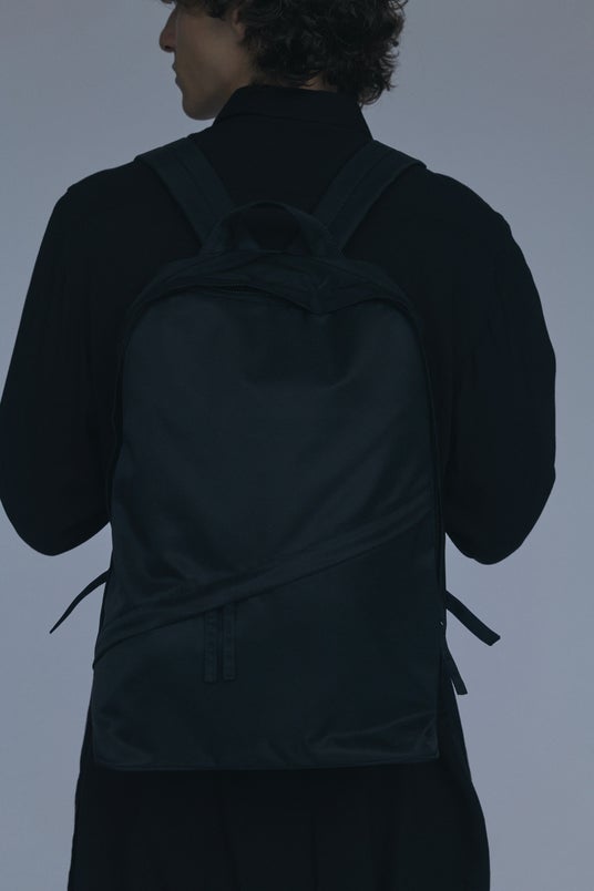 表に斜めのファスナーで収納ポケットの付くリュック。機能的で洗練されたフォルムを表現。