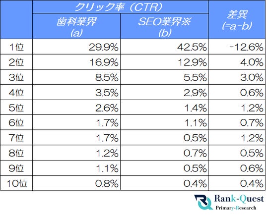 さらに、SEO業界向けのランクエストサイトにおけるクリック率データと比較することで歯科関連サイト特有のクリック傾向を明らかにしました。