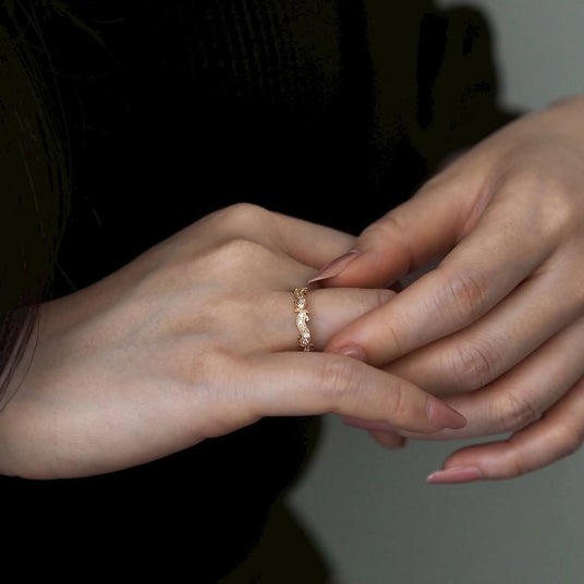 新たにデザインされたフォークリングは、地金に厚みを持たせることで、より存在感のある仕上がりとなっています。アシンメトリーに配置された宝石は、まるで星座のように繊細な輝きを放ち、指元に印象的な表情を添えます。