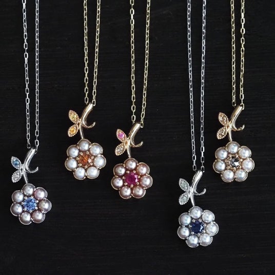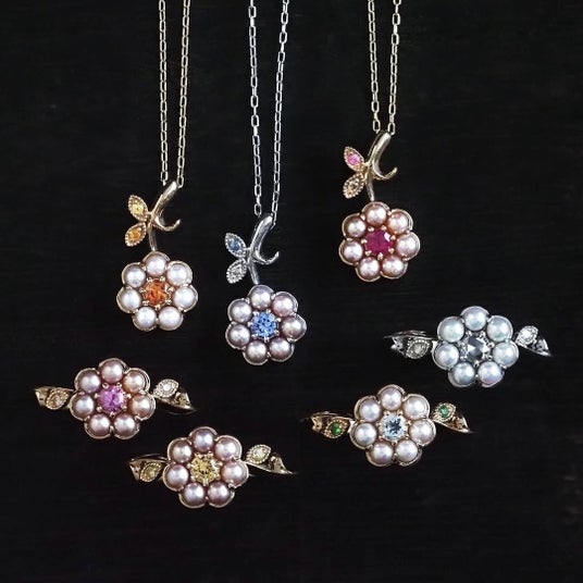 中央に輝くカラーストーンを包み込むように配置された7つの真珠(あこや真珠または湖水真珠)は、これまでの歩みとお客様との大切な記憶を象徴しています。