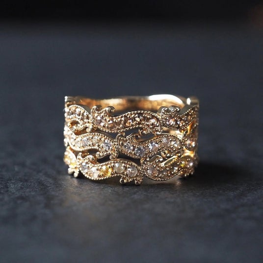 リボンを思わせるしなやかなウェーブが指に自然と馴染み、美しいシルエットを引き立てる新型デザインです。今回のトランクショーでは、カラーダイヤモンドをあしらった特別仕様をご用意しました。流れるようなラインと色彩の調和を感じられる仕上がりとなっています。