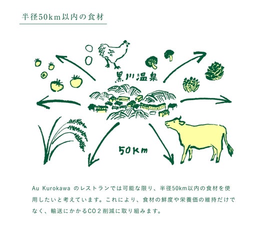 地域共有レストラン「Au Kurokawa」は、「Au(会う) Kurokawa」という名の通り、黒川温泉の旅行者、旅館や地域の事業者、農産物の生産者や飲食店の人々が出会い、集い、言葉を交わし、心を通わせることで、黒川温泉の新たな食の可能性が創造されていく、そのような空間を目指しています。