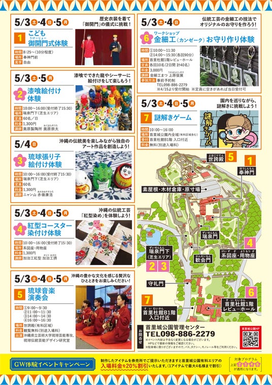 ▶GW体験イベント♪キャンペーン♪体験イベントで制作したアイテムを券売所でご提示いただくと、首里城公園有料エリアの入場料金を20%割引致します。(1アイテムで最大4名様まで割引)