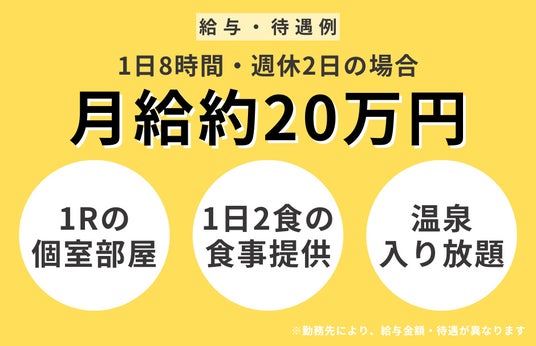 ・基本的には仕事期間中の滞在場所・食事が用意されており、職場によっては温泉入り放題、スキー滑り放題など、リゾート地ならではの特典が用意されていることもある
