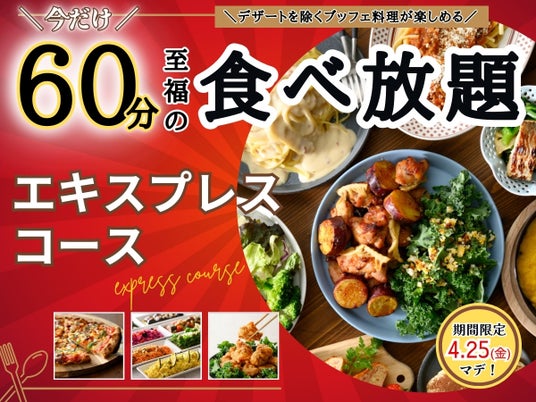 【コスパ最強!!60分間充実の食べ放題!!】4/25迄!バラエティー豊かな食べ放題“ニラックスブッフェ”『45分間』エキスプレスコースの『15分拡大キャンペーン』を開催!リーズナブルに食べ放題を楽しもう!