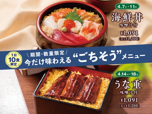 旨味たっぷりのうなぎを贅沢に盛り付けた特製うな重と新鮮な7種類の海の幸を堪能できる海鮮丼が登場。どちらも食べ応え抜群の逸品を毎日限定10食でご提供いたします