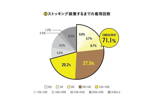 ストッキングを破棄するまでの着用回数は全体の約7割が10回も履かずに破棄していることが明らかに。破棄の理由の約8割が「伝線」