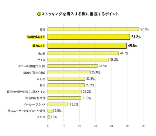 ストッキングを購入する際に重視しているポイントは「価格」「伝線のしにくさ」「破れにくさ」が上位を占める結果に