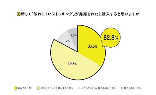 そして、新しく破れに強いストッキングが発売されたら購入するか?に対しては「購入すると思う」(33.5%)「どちらかというと購入すると思う」(49.3%)と回答しており、全体として82.8%が購入に前向きであると言える結果となりました。