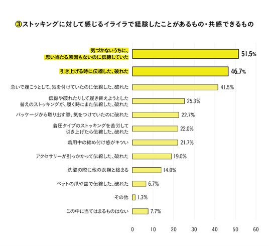 ストッキングに対して感じるイライラとして、ご自身が今までに経験したことがあるもの、共感できるものは何かという質問に対して、1位は「気づかないうちに、思い当たる原因もないのに伝線していた」、2位は「引き上げる時に伝線した、破れた」、3位は「急いで履こうとして、気を付けていたのに伝線した、破れた」となりました。