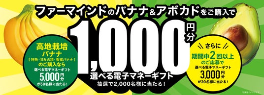 ファーマインドロゴのあるバナナ・アボカド全品を対象に、商品をご購入いただいた方の中から、抽選で2,000名様に【選べる電子マネーギフト1,000円分】が当たります。高地栽培バナナ(対象商品)をご購入のうえ、ご応募いただいた方は、【選べる電子マネーギフト5,000円分】が当たるチャンスも。