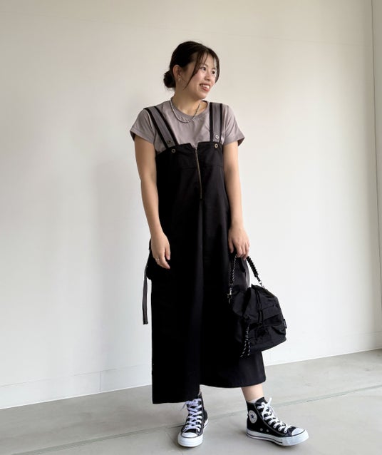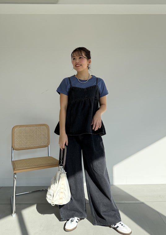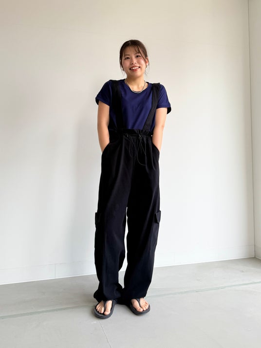 大人っぽいネイビーのTシャツに、あえてダボっとしたサロペットを合わせることで、大人カジュアルなスタイルに。足元はサンダルで抜け感をプラスするのがおすすめです。
