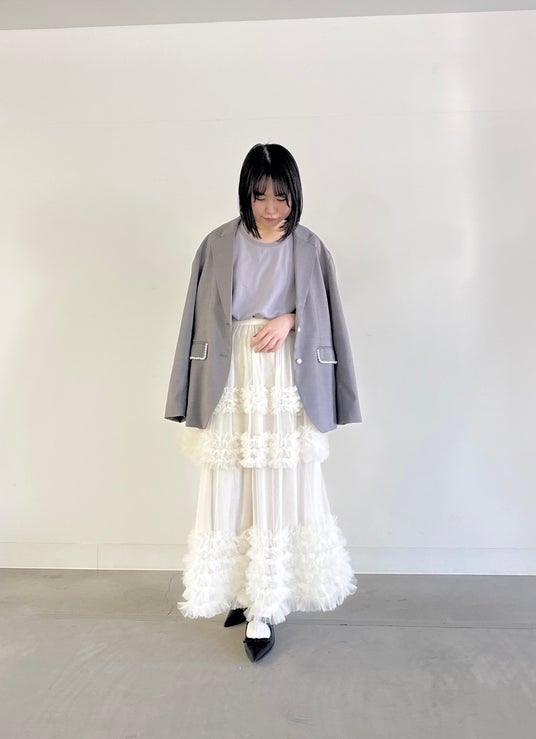 シンプルなTシャツは、甘めデザインのアイテムとも相性抜群。全体をグレーのワントーンでまとめることで、甘さを抑えつつ、おしゃれな印象に。Tシャツのカジュアルさが、大人可愛いスタイリングに仕立ててくれます。