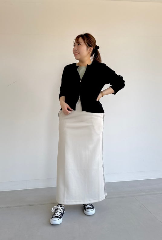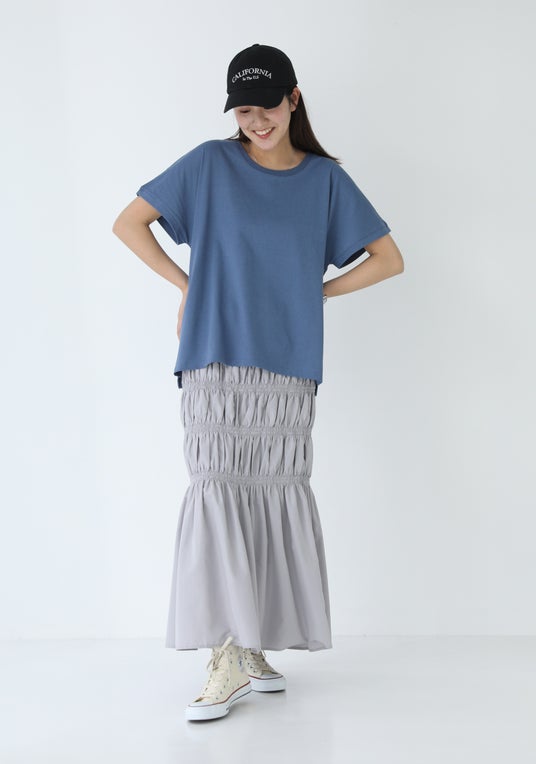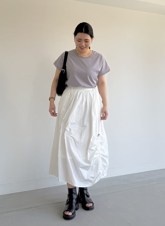 裾に向かって広がるシャーリングスカートは、Tシャツのアウトスタイルと相性抜群。スカートのシルエットがバランスを取り、すっきりとした印象に仕上がります。カジュアルながらも女性らしさを演出できる、おすすめの組み合わせです!
