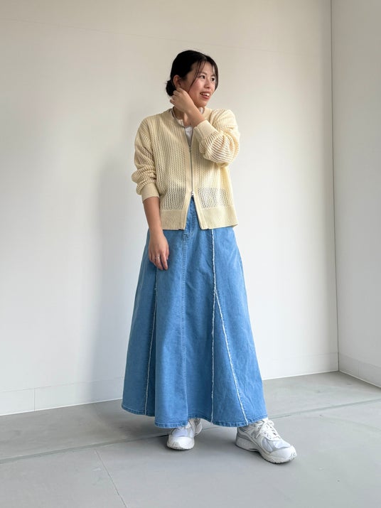 透かし編みニットのインナーにフレンチTを合わせ、春らしいレイヤードスタイルを提案。今の時期にぴったりの組み合わせで、透かし編みニットの抜け感とTシャツのカジュアルさが絶妙なバランスを生み出し、おしゃれ見え効果も抜群です。