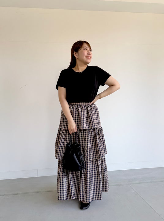 定番のブラックTシャツは、柄物アイテムとの相性も抜群!チェック柄のティアードスカートのように、下にボリューム感のあるアイテムを合わせることで、全体のバランスが取れたコーディネートに仕上がります。
